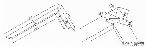 左右冒挺的尺寸為外側(cè)長度2 024 mm、內(nèi)側(cè)長度1784 mm,寬度120mm,高低冒頭的外側(cè)長度840mm、內(nèi)側(cè)長度600mm、寬度120mm,厚度均為40mm。左冒挺與上冒頭接合縫的角度為45°,如下圖所示,4個角均采取該接合方法。