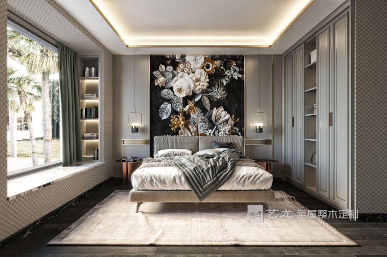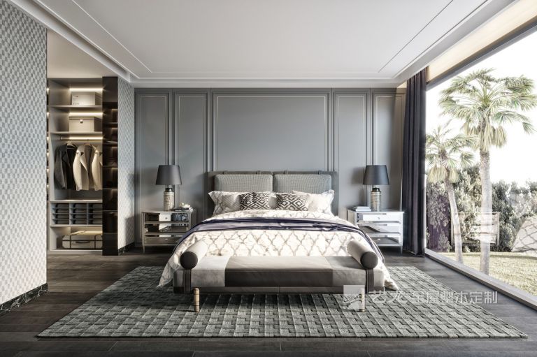 臥室的整個墻面是淺灰色,床品、軟裝也是灰白色的,搭配淺灰色的衣柜、床頭柜等家具,整個臥室看起來非常輕松和舒服。